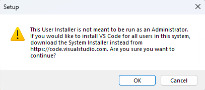 This is normal. The “User Installer” is designed to install VSCode only for your current user account without needing admin rights. Simply click OK to continue. You do not need the “System Installer” for this course.
