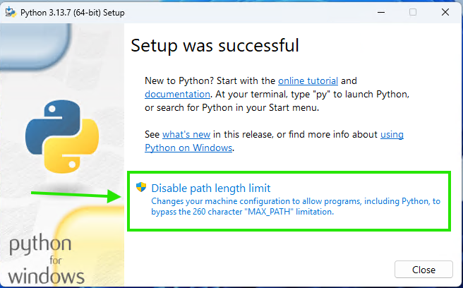 - Finalize the Installation (Important for Windows): On the final “Setup was successful” screen, you will see an option to “Disable path length limit”.