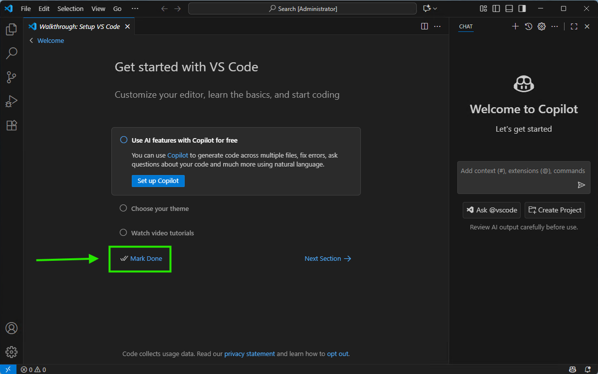 - Dismiss the Welcome Screen. To prevent this “Get Started” screen from appearing every time you open VSCode, look for the “Mark Done” link in the lower-left area of that central panel and click it. This tells VSCode you’ve completed the tour and gives you a clean workspace for all future sessions.