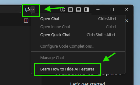 - In the top right corner of the VSCode window, find the Chat icon. Click on it to open a menu. From that menu, select the option “Learn How to Hide AI Features”.