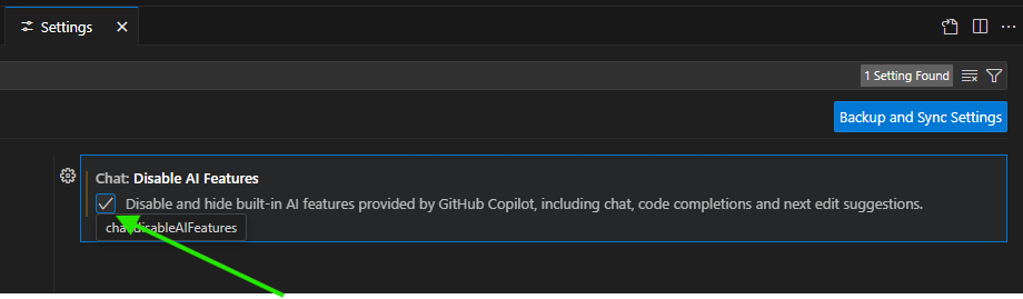 - This single action will disable and hide all built-in AI features, including chat, code completions, and suggestions. You can now close the “Settings” tab.