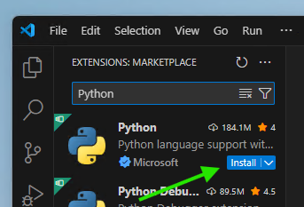 . - Find the extension named “Python” published by Microsoft. It will be the first and most popular result. Click the blue Install button. This extension provides features like code highlighting and error checking.