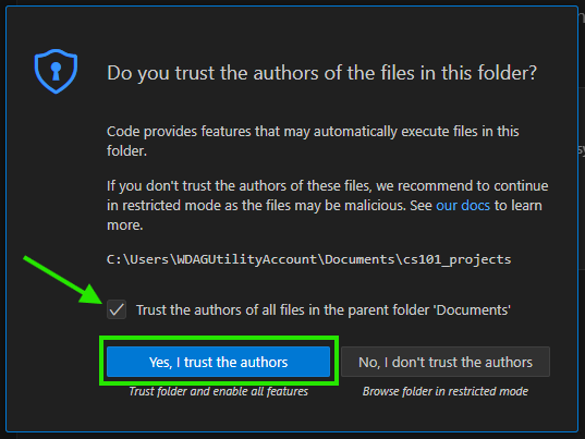 - Action: Check the box that says “Trust the authors of all files in the parent folder…“ and then click the blue button “Yes, I trust the authors”. This is a convenient way to ensure you won’t be asked again for other projects you create in the same parent directory (like ‘Documents’).