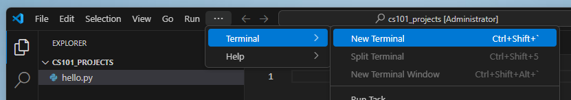 extension is essential—it tells VSCode and your computer that this is a Python file. - Open the Terminal: Go to the top menu and select